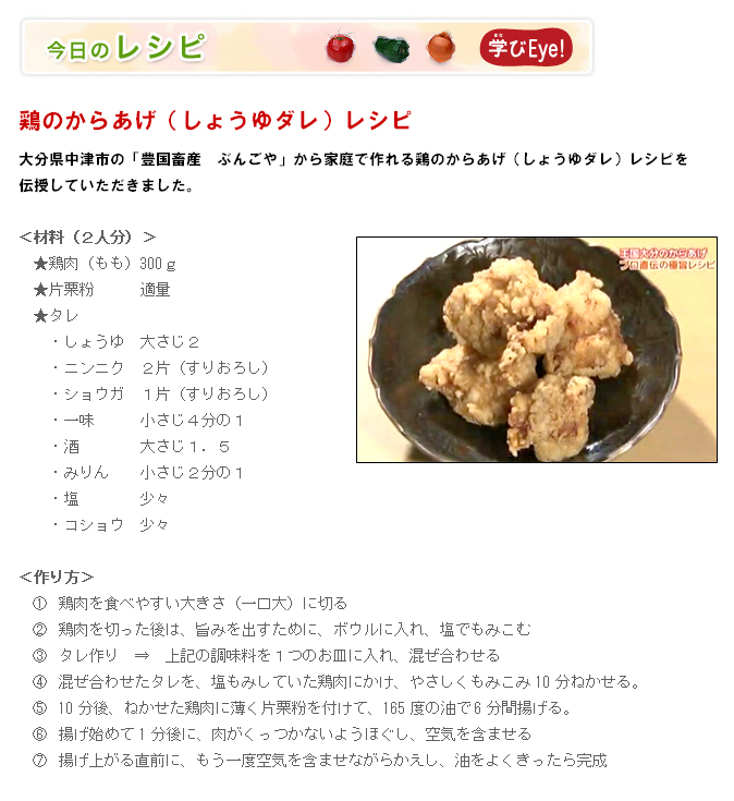 からあげのみを扱うという”専門店の存在”とその”店舗の多さ”、そして、地域に根付く”独特のからあげ文化”が、メディアなどを通じて紹介され、人気に火がついた、中津&宇佐のからあげ。生命線ともいえるタレは、素材選びから分量、配合まで、長い年月をかけて完成させたもので、家庭では生み出せない、プロの技を垣間見ることができました。番組では、調味料の詳細など”企業秘密”という形での放送となり、全容をお見せすることができませんでしたが、ぜひ味わっていただきたい逸品ばかりです。大分といえば、郷土料理の一つ”とり天(鶏肉の天ぷら)”を思い浮かべる方もいらっしゃると思いますが、その”とり天”料理の発祥とされる別府市や大分市では、からあげ専門店は決して多くありません。同じ県内でも、地域に根付く食文化の違いを、改めて気づかされると同時に、からあげを含む、大分の”鶏の食文化”についても、新たな”学び”を発見できそうな予感です。