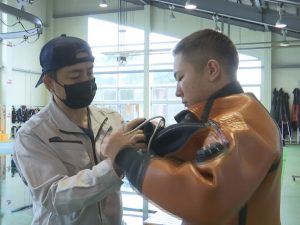 北海道根室市からやってきて、「ヘルメット一択ですね」と語る佐藤瑳武(さむ)さん。漁師の家に生まれ、幼いころから父の船に乗るヘルメット式の南部もぐりに憧れて育ちました。将来はヘルメット式でウニをとりたい…という夢をもって種市高校で学び、今年卒業しました。